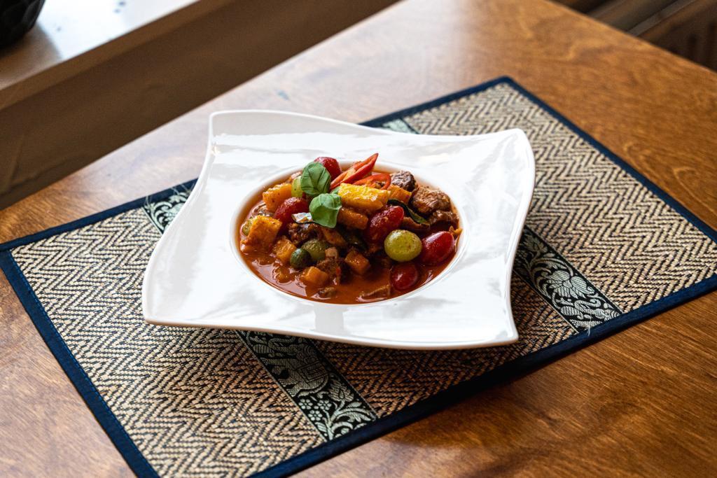 Keng Phed Ped Yang (rode curry met geroosterde eend en o.a. ananas)